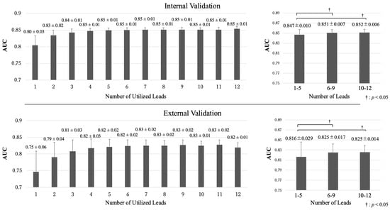 Initially, reducing the number of leads from 12 had a minimal impact on accuracy. However, a significant decline in the diagnostic accuracy was observed when the number of leads was reduced to five or fewer (Figure 5). Models with five or fewer leads showed an AUC of 0.847 ± 0.010, which was significantly lower than that of models with 6–9 leads or 10–12 leads (0.851 ± 0.007, 0.852 ± 0.006, p < 0.05, respectively) during the internal validation. In the external validation, the results were similar, with models having five or fewer leads exhibiting lower performance as compared to those with six or more leads (AUC 0.816 ± 0.029 versus 0.825 ± 0.017, 0.825 ± 0.014, p < 0.05, respectively).