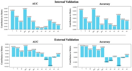 Contribution of each single lead. The contributions of each lead were calculated as the difference between the average metrics of the models that included the specified lead and the average metrics of the models that did not include the lead. During internal validation, the contribution of the limb leads was generally larger compared to the precordial leads. In external validation, the precordial leads showed a negative contribution to the detection of ventricular dysfunction.