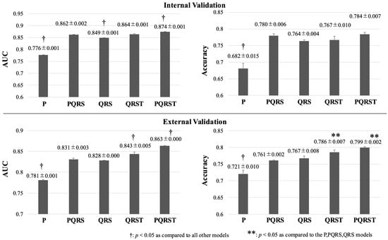In the external validation (Figure 6), the PQRST (⑤) model exhibited the highest accuracy, followed by the QRST (④) model (AUC 0.863 ± 0.001 and 0.843 ± 0.005, respectively). The performances of the other three models were significantly lower than these two models (AUC 0.781 ± 0.001, 0.831 ± 0.003, and 0.828 ± 0.004, for P (①), PQRS (②), and QRS (③) segment models, respectively, p < 0.05).