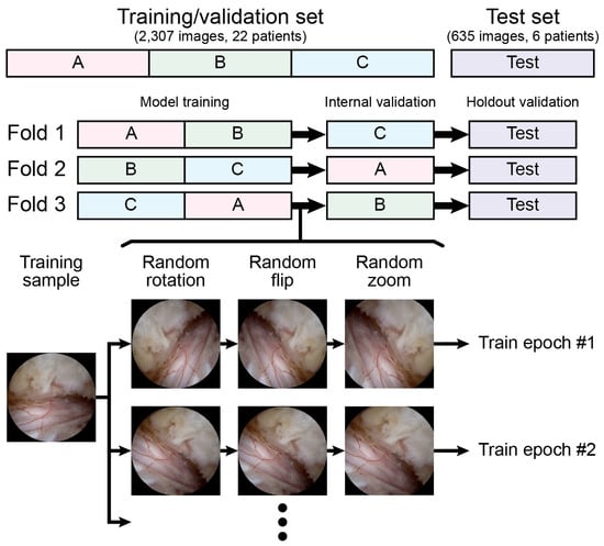 No preprocessing methods other than resizing or rescaling were applied. We aimed to evaluate the performance of the model under raw conditions to provide more generalized applicability across diverse clinical settings. Data augmentation, which consists of random rotation from −180 degrees to +180 degrees, random flip, and random zoom from 1.0 times to 1.2 times, was applied only during the training of each fold. No augmentation was applied during the internal validation and testing. Unlike common practice, where the training set is expanded by fivefold to tenfold, we did not expand the training set but instead applied random image transforms for each epoch, as illustrated in Figure 2, allowing the model to experience multiple random variations of the original training sample.