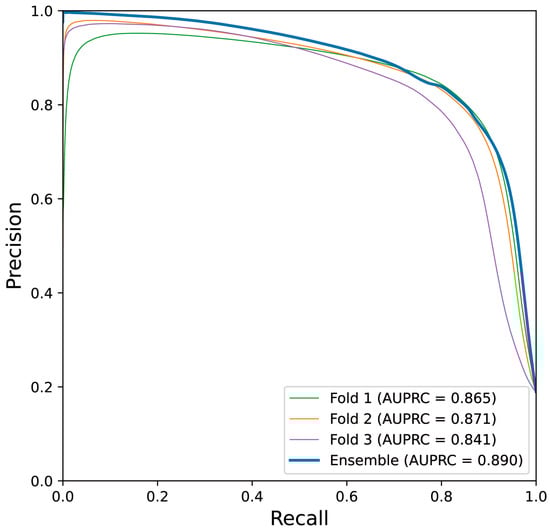Precision and recall are defined in Equations (4) and (5) and are widely adopted to measure a model’s performance. Given that their values are dependent on the decision boundaries, the precision–recall curve and the area underneath were also assessed. The area under the precision–recall curve (AUPRC) is also known as average precision (AP).