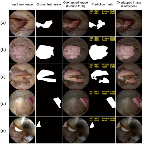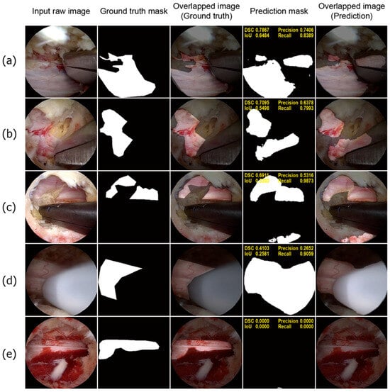 Figure 4 shows a few well-performing test samples. In contrast to the rigid and relatively crude polygon-shaped ground truth masks generated manually using LabelMe, the prediction masks tended to be smoother and more descriptive. Moreover, Figure 4a–c show that the deep learning model effectively learned to exclude perineural fat, which often overlaps with neural tissue. Additionally, the model performed well on challenging samples, where only a small portion of the neural tissue was observed, as depicted in Figure 4d,e. Therefore, it can be concluded that the model successfully learned the distinct features of the neural tissues during spinal endoscopic surgery.