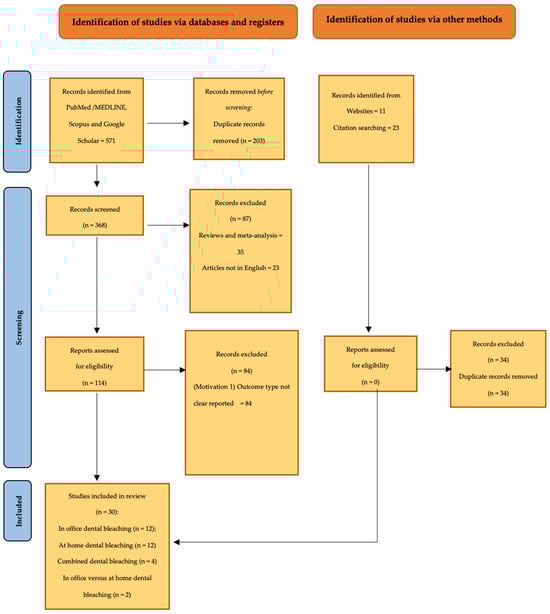 In the first phase, results were filtered to focus on professional in-office and/or at-home dental bleaching studies. Studies that did not meet the eligibility criteria, such as reviews, meta-analyses, and studies not published in English, were excluded.