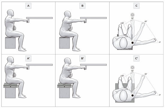 In (A–C), the Modified Functional Reach Test (mFRT) in a seated position in three directions. (A’–C’) the mFRT clinical test on force plate sitting.