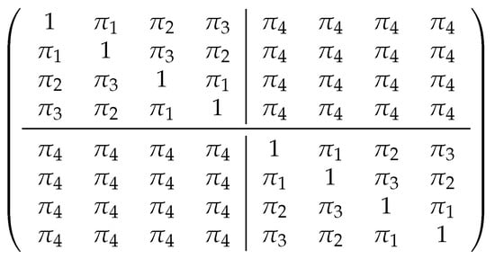Illustration of the correlation matrix of four genes with two omics each, partitioned into two clusters. The first two genes make the first cluster and the last two genes make the second cluster. The first two columns represent omics 1 and omics 2 of the first gene, the following two columns represent omics 1 and omics 2 of the second gene, followed by omics 1 and omics 2 of the third gene, the last two columns represent omics 1 and omics 2 of the fourth gene.