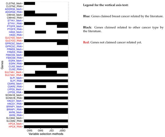 The omics selected by each variable selection method are summarized in the heatmap shown in Figure 3 where each row represents an omics and each column a variable selection method. Black rectangles represent the omics selected by the corresponding variable selection method whereas white rectangles show the omics that are not selected by the corresponding variable selection method. Omics names are written in the format “Gene name_Omics type”. We extensively investigated whether selected genes are known to be associated with breast cancer, any other type of cancer, or have never been found to be related to breast cancer or other type of cancer. The genes in blue are the ones that have been claimed to be related to breast cancer by the existing literature [,,,,,,,,,,,,,,,,,,,]. The genes in black are the ones that have not been claimed to be related to breast cancer, but have been claimed to be related to other type of cancer [,,,]. The genes in red are the ones that are not known to be related to cancer. Among the genes selected by at least one variable selection method, JBSD missed one gene (ADGRG6) related to breast cancer whereas JSD, GMS and OMS missed 5 genes related to breast cancer. This shows that the variable selection method with JSBD selects more genes related to the progression of breast cancer. HPCA, SLC9A2, SCNN1B, SULT4A1, and GUCY2D selected by the variable selection method with JSBD, that have not been identified by the literature as breast cancer related were also selected by all the other variable selection methods. Thus, these 5 genes may be associated with breast cancer progression. SLC9A2 and SCNN1B which are known related to other type of cancer might have been selected due to the metastasis that happens in the breast cancer late stages. Therefore, the other 3 genes (HPCA, SULT4A1, and GUCY2D) might be related to breast cancer progression either directly or indirectly by being related to other cancer type. Further biological investigations are needed to confirm our discovery. Currently, it is known that HPCA, SULT4A1, and GUCY2D are related to dystonia [], brain diseases [,], and retinal diseases [,] respectively. Extensive investigations were done on omics but we could not find any result from the literature. More biological experiments need to be carried out to validate our results on omics. Table 5 summarizes the genes selected by the proposed JSBD variable selection method. As shown in the heatmap, this method identified genes known to be associated with breast cancer, genes associated with other cancer types, and genes not yet linked to cancer. Thus, JSBD identified SLC9A2, SCNN1B, HPCA, SULT4A1, and GUCY2D as new breast-cancer-progression-related genes.
