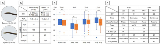 Breakdown of patient and equipment conditions for cataract surgery. (a) Appearance of M-tip and P-tip. (b) Breakdown of patients treated with M-tip and P-tip. (c) No significant differences in patient age were observed across all cases and by Emery–Little classification grade. (d) Ultrasonic power and irrigation settings were standardized. Abbreviations: AFR, aspiration flow rate; AP, aspiration pressure; F, female; IOP, intraocular pressure; M, male; pps, pulse per second; US, ultrasound; n.s., not significant.