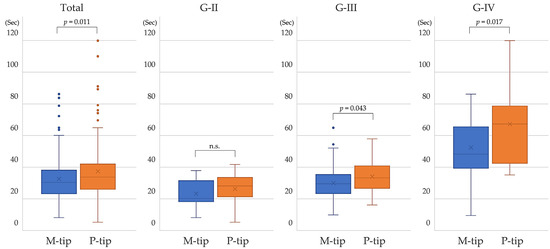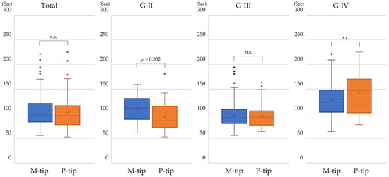 Comparison of total ultrasound time between M-tip and P-tip by nuclear hardness. The M-tip required significantly less time than the P-tip in all cases for G-III and G-IV. There was no significant difference for G-II. Abbreviations: n.s., not significant.