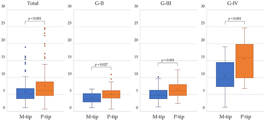 There was no significant overall difference in total estimated fluid aspirated between the groups. However, the P-tip showed a slight but significant reduction in fluid aspirated for G-II (p = 0.026). Averaged over all cases, the P-tip aspirated 3.0% less fluid compared to the M-tip (Figure 5).