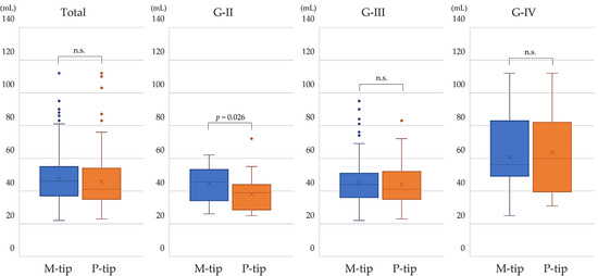 Comparison of total estimated fluid aspirated between M-tip and P-tip by nuclear hardness. The P-tip was associated with a significantly lower amount of fluid aspirated in G-II. No significant differences were observed in G-III, G-IV, or across all cases or nuclear hardnesses. Abbreviations: n.s., not significant.