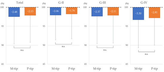 Comparison of corneal endothelial cell reduction rate between M-tip and P-tip by nuclear hardness. No significant differences were observed across all cases or nuclear hardness levels. Abbreviations: n.s., not significant.
