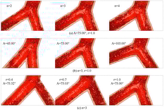 Blood simulation under bifurcating arteries with different structures. Rendering results consist of all cases in Table 2, where (a) corresponds to G1–G3, and (b,c) are G4–G6 and G7–G9, respectively.