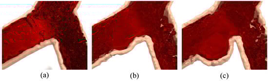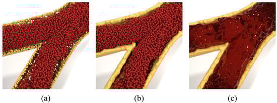 In order to more intuitively illustrate the blood simulation based on SPH pure particle method in this research, Figure 3 shows the rendering results of blood and blood vessel walls in two different forms: (a) where both blood and blood vessel walls are represented as particles, (b) where blood is represented as particles and blood vessel walls as a grid fluid, and (c) where both are represented as grid fluids. To facilitate the observation of blood flow patterns, the top part of the blood vessels is hidden in the experimental rendering. The blood flow inlet end of the blood vessel is in the upper part of the vessel in the figure.