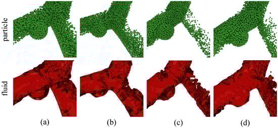 In order to prove the universality of the aneurysm lesion simulation proposed in this research, the experiment of the bifurcation aneurysm lesion simulation was carried out on the bifurcation vessels with different structures. To realize aneurysm simulation under different vascular structures, only the aneurysm lesion site needs to be set before the beginning of simulation. Figure 5 shows the simulation results at the later stage of aneurysm growth (frame 5000) under four different bifurcation vessel structures with obvious discrimination. In order to observe the blood morphology more clearly, only the blood particle morphology and grid liquid morphology are presented in the figure, and the blood vessel model is hidden. Columns (a), (b), (c), and (d) in Figure 5 correspond to schemes G1, G6, G7, and G8 in Table 2, respectively. The first is a blood particle made of green material, and the second is a grid liquid made of translucent red material.