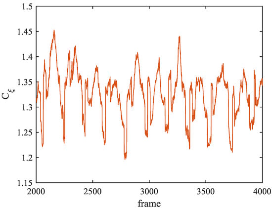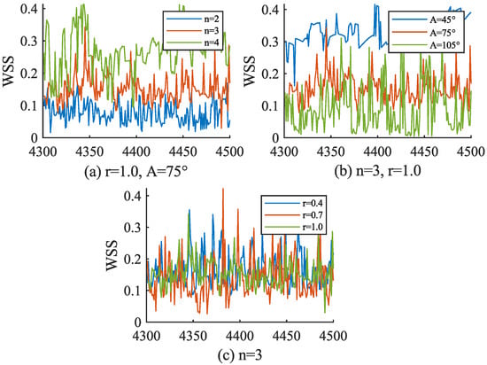 As a crucial blood flow parameter, WSS is discretized by the SPH method in this research. According to the calculation of in Equation (17), the number of neighboring particles has a strong correlation with the calculation result of WSS, so the experiment analyzes the change in . Figure 6 shows the mean change in corresponding to all blood particles participating in the WSS calculation as vessel walls in each frame from frame 2000 to frame 4000 of the simulation. It can be found from Figure 6 that the value of is maintained between 1.20 and 1.45, and presents obvious periodic changes. It shows that the calculation method of WSS in this research is feasible. The periodic change shown in the figure is caused by particle circulation, which also indicates that the experimental blood simulation can restore the pulse of the blood system to a certain extent. Since WSS can reflect the characteristics of vascular diseases, this experiment carried out a visual analysis of WSS at the aneurysm mouth. Figure 7 shows the WSS curve from frame 4300 to frame 4500 at the aneurysm mouth under the bifurcation vessel structure scheme listed in Table 2. Figure 7a,b show the WSS changes at the tumor mouth under different vascular structures with N and A as variables, respectively. It can be found from the curves in the figure that the WSS values of different bifurcation index N and different bifurcation Angle A have obvious differentiation, while Figure 7c takes the radius ratio as the variable value curve, it can be found that there is no significant difference in WSS changes under different r values. According to Murray’s Law, the vascular structure (G7, G8, G9) in Figure 7c is close to the optimal structure, so the small difference in the figure reflects the reliability of the WSS calculation method in this research. As for Figure 7a,b, the deviation of bifurcation index and bifurcation angle both have an impact on the size of WSS. Therefore, monitoring the size of WSS at the aneurysm orificium in the simulation can be used as an indicator for further analysis of aneurysm lesions.