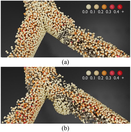 In order to further analyze the visualization of WSS in blood vessel walls in the blood simulation, the experiments in this research present WSS in the form of three-dimensional particles, and as a visualization method for the SPH method to enrich the analysis method of WSS. Figure 8 shows the visualization results of blood flow WSS in (a) and (b) without aneurysm and with aneurysm. In the figure, the blood particles involved in WSS calculation are also regarded as wall particles, and the size of WSS is distinguished according to the color level. The lighter (light yellow) particles represent the smaller WSS at the site, and the darker (red) particles represent the larger WSS, while the remaining particles are pure blood particles, represented by gray material. Observing the color distribution of particles, we can see that the WSS visualization method presented in the form of particles in this research can effectively reflect the distribution of WSS.Furthermore, we provide a demonstration video to showcase the visualization effect, which is available in the (Supplemental Video S1).