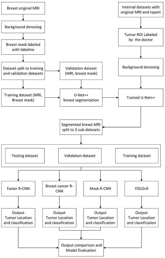 As shown in Figure 1, Our study included breast segmentation and breast cancer detection. We used U-Net++ for breast segmentation, and the dataset consists of axial and sagittal breast MRIs and some single breast MRIs. It also included internal and external datasets, with 5–10 slices selected from different locations for each breast, some of which contained tumors, as well as dense and fat breast types. Labelme was used for polygon annotation and mask generation. The dataset was divided into training and testing sub-datasets after background denoising, and the Unet++ network was trained and tested. Regarding breast tumor detection and classification, the internal dataset was annotated by doctors using ITK-SNAP based on MRI reports. The Duke breast cancer cases have already been annotated. The trained Unet++ was used to segment the MRI after denoising. The segmented MRI and labeled coordinates were made into the VOC2007 dataset format. Finally, our model was trained and tested separately with Faster RCNN, Mask RCNN, and YOLOv9 [33] for comparative evaluation.