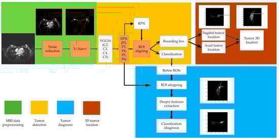 In this study, to obtain a more precise ROI and reduce the interference of the other tissues, a novel, precise deep network (PDN) for extracting the precise and deeper features was proposed and combined with the advantages of the Faster R-CNN and Mask R-CNN to implement the breast tumor detection and diagnosis. We denoised the MRI scans and segmented the breast with the U-net++ first [30]. We adopted the Vgg16, region proposal network (RPN) [26], feature pyramid network (FPN) [31], and ROI aligning for breast tumor detection. Lastly, we implemented the PDN to make the final diagnosis.