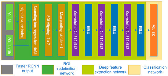 Tumor diagnosis was based on the PDN, which incorporated three critical steps: refining the ROI, extracting deep feature maps, and performing classification (Figure 3). The original Faster R-CNN architecture consisted of two fully connected layers (FCLs). The first FCL generated 4 × K regression parameters, including two scales and two shift parameters, for each candidate, resulting in K ROI candidates. Our study focused on three ROI classes: benign tumor, malignant tumor, and background. We set the number of ROI candidates to 300, leading to a total of [300, 12] parameters for ROI regression. The second FCL was responsible for classifying all 300 ROI candidates. Each candidate had three scores representing the probability of each class. Therefore, there were [300, 3] classified scores in total. In the original Faster R-CNN architecture, the ROI after regression was the final ROI, and the highest classified score determined the last label.