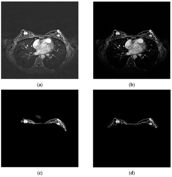 Background noise reduction: (a) MRI before noise reduction; (b) MRI after noise reduction; (c) segmented breast of original MRI; (d) segmented breast of noise reduction MRI.