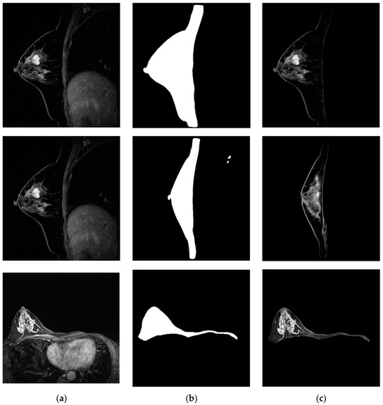 U-Net++ breast edge segmented: (a) sagittal breast MRI and single breast MRI at axial plane; (b) masks; (c) segmented breasts.