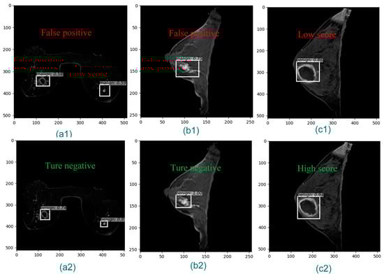 Breast tumor location and diagnosis comparison of Faster R-CNN and our proposed model: (a1,b1,c1) detected by Faster R-CNN; (a2,b2,c2) detected by our proposed model. (a1,b1) false positive; (c1) diagnosed with a lower score; (c2) diagnosed at a higher score.