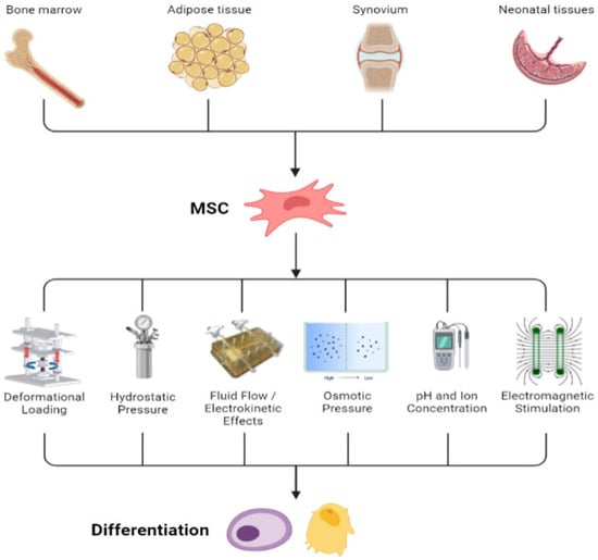 Sources of MSCs and physical factors that can stimulate MSC differentiation into osteogenic cells. Figure from Hung et al. [].