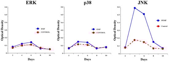 Poh et al. showed that PEMF induced protein kinase B (Akt) and activation of the MAPK/ERK signaling cascade. This significantly upregulated osteocalcin, collagen type I, and alkaline phosphatase levels []. ARs activate MAPKs and, thus, provide an intracellular pathway for PEMF signaling. As a result of MAPK activation, PEMF upregulates ECM molecules, collagen type I, alkaline phosphatase, and osteocalcin []. Figure 2 describes how JNKs, a MAPK subunit, seem to be the most affected by PEMF exposure.