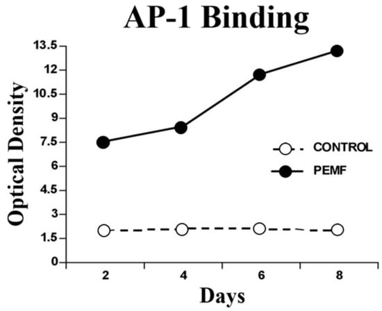One of the transcription factors activated by MAPKs is activating protein-1 (AP-1), which controls several cellular responses and regulates gene expression from external stimuli. Notably, AP-1 is a transcription factor for TGF-β, and it is enhanced by PEMF exposure. Electromobility shift assay (EMSA) of nuclear extracts has shown that, in experimental endochondral ossification, PEMF stimulation bound AP-1 at a significantly higher rate at all times compared to non-PEMF-stimulated endochondral bone formation, indicating increased transcriptional activity []. These results are described in Figure 3. As a consequence of nuclear activation by AP-1, a variety of structural and signaling proteins that are essential for successful bone healing are synthesized. These proteins include osteoprotegerin, osteocalcin, and collagen type I.