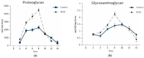 (a) In experimental endochondral ossification, PEMF stimulation produced a significant increase in proteoglycan synthesis on day 4 of stimulation, peaking at day 8 before dropping down to normal levels associated with calcification. (b) PEMF stimulation gradually increased glycosaminoglycan content between days 4 and 8 prior to calcification onset on day 10. Reprinted with permission from Ref. []. 2024, Oxford University Press.