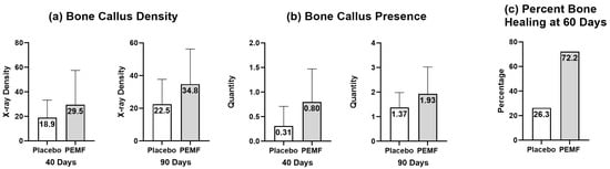 Adapted from Massari et al. []. Data are presented as mean +/− standard deviation. (a) represents increased bone callus density measurements at both 40 and 90 days with PEMF stimulation compared to placebo from Borsalino et al. (b) represents increased bone callus quantity measurements at both 40 and 90 days with PEMF stimulation compared to placebo. (c) represents an increased percentage of bone healing at 60 days with PEMF stimulation compared to the placebo from Mammi et al.