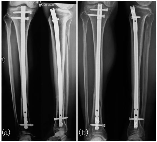 Delayed Union of Tibial Fracture in a 65-year-old Patient Treated with PEMF. (a) Delayed union present after closed reduction and intramedullary fixation 16 weeks post-op. PEMF treatment was initiated at this stage. (b) Fracture union observed at the 3-month treatment mark. Figure from Shi et al. [].