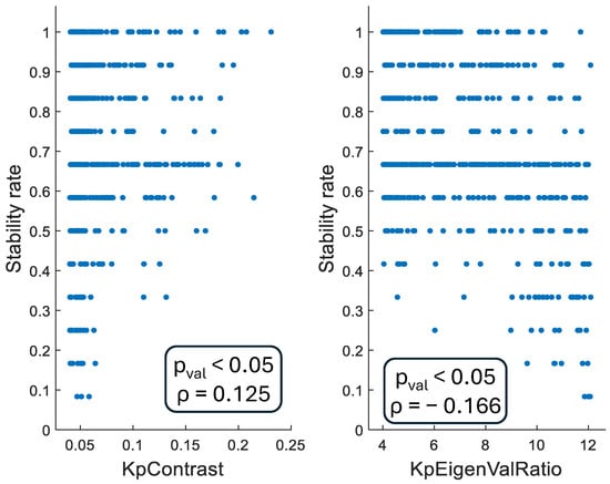 The evaluation of the relation between stability rate and the algorithm parameters involves all keypoints in the original dataset and their transformed version, totaling 4785 keypoints. Figure 2 shows that a statistically significant relationship has been found both between stability rate and keypoint contrast ( ρ = 0.125 , p v a l u e < 0.05 ) and between stability rate and keypoint eigenvalue ratio ( ρ = 0.166 , p v a l u e < 0.05 ). The sign of the correlation coefficient ρ is in agreement with the two threshold meanings. Increasing values of the contrast parameter are associated with the higher the stability of that keypoint (positive monotonic relationship), concluding that keypoints closer to the threshold are less stable than those quite larger than the threshold itself. Therefore, a larger contrast threshold helps to reject the keypoints having a small stability. On the other hand, the lower the eigenvalue ratio parameter, the higher the stability of that keypoint (negative monotonic relationship). Therefore, using the same argument, a lower contrast threshold than the default one improves the probability of selecting the most stable keypoints.
