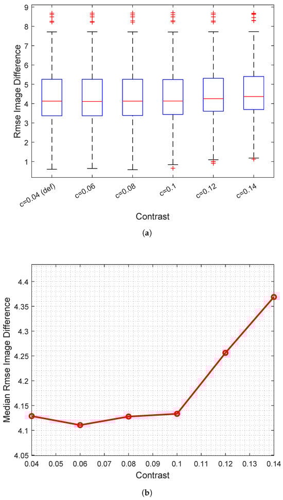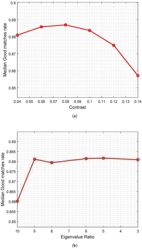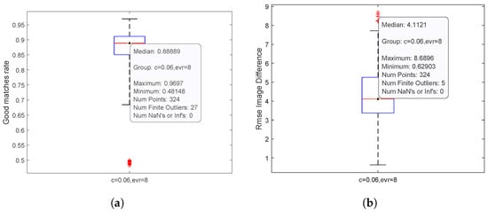Figure 3, Figure 4 and Figure 5 show the results. First of all, an increase in the median good matches rate has been observed with respect to the default threshold values (Figure 3). From a certain value on, the trend remains constant or slightly decreases; this event is due to the fact that the detected keypoint number drops as the threshold becomes more restrictive; therefore, there is also a lower probability of having a higher number of good matches. At first sight of the boxplots in Figure 4a and Figure 5a, it is possible to notice that the distribution of the rmse of the difference image is quite similar at varying contrast and eigenvalue ratio values.