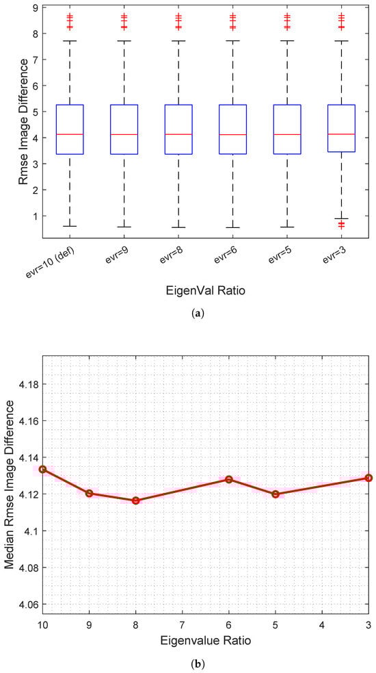 Figure 5. (a) Box plots representing the distribution of the root mean square error of the resulting difference image after the registration at variable eigenvalues ratio thresholds. (b) Focusing on the median trend, it is possible to observe that there are no substantial differences in the resulting output if the threshold is reduced. This suggests that the keypoints discarded using a lower threshold do not significantly participate in the correct output registration.