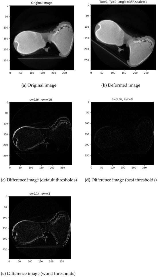 In Figure 6, an example of images alignment obtained using different SIFT thresholds is presented. In particular, Figure 6a,b are the reference and deformed image, respectively. Figure 6c is the registration output, expressed as difference image, obtained using default SIFT thresholds ( c = 0.04 , e v r = 10 ). Instead, Figure 6d the output obtained with the thresholds that better performed, according to Figure 4 and Figure 5, corresponding to c = 0.06 and e v r = 8 . Finally, Figure 6e the output was obtained with the thresholds that gave the higher rmse in image difference, according to Figure 4 and Figure 5, corresponding to c = 0.14 , e v r = 3 ). As expected, the best result was obtained using the thresholds that minimize the rmse of the image difference, as highlighted with the statistical analysis.