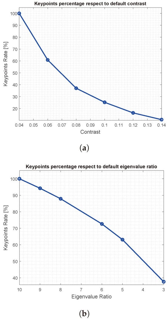 Figure 8. Keypoints number trend using different SIFT thresholds, normalized respect to the keypoints amount detected with the default values. (a) Varying the contrast threshold, on the basis of the results shown in Figure 4, it is possible to discard about 50% of the keypoints to obtain the same result as in the original case. (b) Regarding the variation in the eigenvalue ratio threshold, to obtain the best result in terms of image difference rmse (see Figure 5), about 80% of the keypoints are needed.