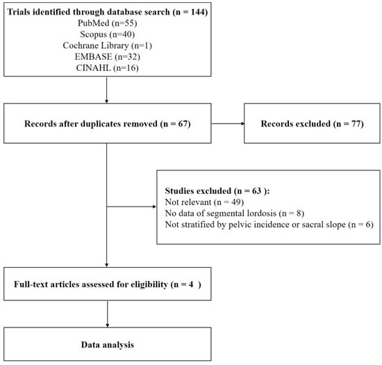 A comprehensive database search was initially conducted to identify studies examining the intersection region of segmental lumbar lordosis in asymptomatic adults. A total of 144 studies were initially identified through the database search. After removing 77 duplicates, 67 studies remained for further screening. A stringent screening process, guided by predefined inclusion criteria, was employed to ensure analytical accuracy and reliability. Titles and abstracts were reviewed to determine relevance, and studies were excluded if they involved inappropriate study populations, insufficient sample sizes, or lacked adequate data on segmental lumbar lordosis. Following this screening process, 63 studies were excluded based on these criteria. Ultimately, only four studies met the inclusion criteria and were included in the final analysis. Figure 1 presents a flowchart of the study selection process for the literature review, detailing the number of studies assessed at each stage and the reasons for exclusions. This flowchart provides a transparent and reproducible overview of the selection process, enhancing the credibility and rigor of the literature review.