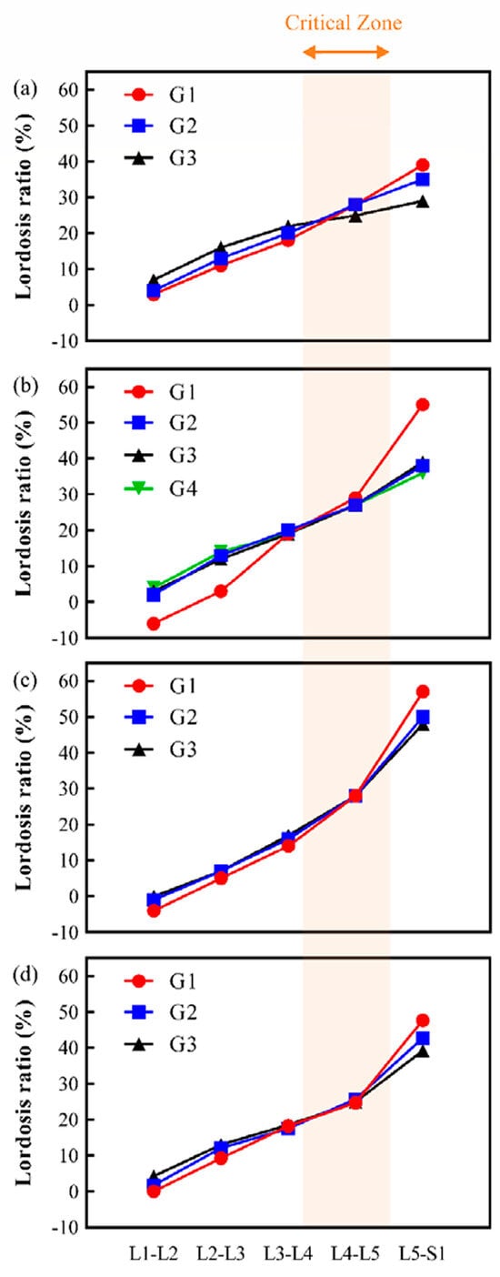 Figure 2. Critical zone (a) trends in the lordosis ratio from the data of Pesenti et al. []. Patients were divided into low- (<45°, G1), average- (45°−60°, G2), and high (>60°, G3)-PI groups. (b) Trends in the lordosis ratio from the data of Chung et al. []. Patients were grouped into type 1 (38.6° ± 7.9°, G1), type 2 (43.2° ± 6.3°, G2), type 3 (51.4° ± 6.8°, G3), and type 4 (62.9° ± 7.9°, G4). (c) Trends in the lordosis ratio from the data of Baker et al. []. Patients were categorized into low- (≤45°, G1), average- (46°−60°, G2), and high (>60°, G3)-PI groups. (d) Trends in the lordosis ratio from the data of Mi Le et al. []. Patients were stratified into low- (<45°, G1), average- (45°−55°, G2), and high (>55°, G3)-PI groups. - Chung et al. (Korea) []: Using the Roussouly classification, this study stratified patients into four pelvic incidence types: type 1 (38.6° ± 7.9°), type 2 (43.2° ± 6.3°), type 3 (51.4° ± 6.8°), and type 4 (62.9° ± 7.9°). The four groups were defined as G1, G2, G3, and G4, as shown in Figure 2b. Within these groups, intersection regions were observed between L3 and L5 in 34.1% to 57.1% of patients, with 9.8% to 24.2% showing intersection within L4–S1 (Table 2).