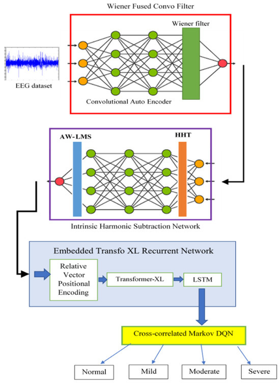 Figure 1 illustrates the block diagram of the proposed model. Initially, the data from the EEG dataset are sent to the Wiener Fused Convo Filter network, where CAE captures complex spatial features and the Wiener filter removes the linear noise components from EEG signals. Then, the denoised signal is sent to the Intrinsic Harmonic Subtraction Network, which uses the HHT and AW-LMS algorithm to eliminate the misinterpretation of the harmonic signal. Then, the temporal continuity of the data in the EEG is captured with the Embedded Transfo XL Recurrent Network, using relative vector positional encoding, Transformer-XL, and LSTM. Finally, the harmonic-reduced and temporal-feature-extracted EEG data are processed for classification using the cross-correlated Markov DQN, which classifies the anxiety levels (normal, mild, moderate, and severe) based on the extracted features and correlation analysis.