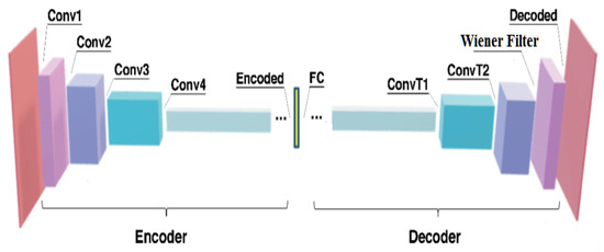 Figure 2 shows the architecture of the Wiener Fused Convo Filter Network, which combines the Wiener filter and a CNN for pre-processing. Here, the Wiener filter is placed at the last layer of the CAE to eliminate the linear noise components in the EEG data. Complex spatial properties are captured by the CAE, which is trained on a dataset containing clean EEG data. During training, it learns to encode and decode these clean EEG signals, capturing their essential features. Once the CAE is trained, it is used to estimate the noise characteristics present in detected EEG signals. This process is explained in Equation (1), as follows: