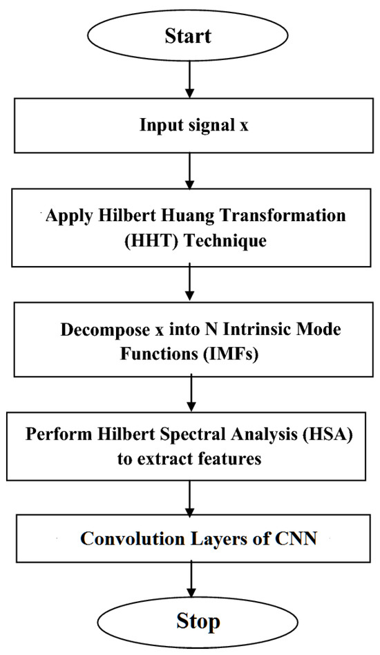 Figure 3 demonstrates the flowchart of the HHT process of the proposed system. The signal represented by is then fed into the system to be processed in the following phase. After that, the signal is subjected to the HHT approach, a non-stationary and nonlinear data analysis method. Subsequently, the signal is broken down into its intrinsic mode functions (IMFs), which are its core elements. Hilbert Spectral Analysis (HSA) is then used to extract features from the signal, providing a detailed representation of its frequency components across time. These features, derived from the HHT method, are rich in both time–frequency information, capturing the non-linear and non-stationary nature of EEG signals. To ensure compatibility with the CNN input expectations, the extracted features are first normalized and aligned. This preprocessing step standardizes the data, allowing the CNN to effectively process and learn from the temporal and spectral patterns inherent in the EEG signal. This alignment involves resizing and padding sequences to ensure uniformity, thereby preventing mismatches in sequence lengths between different EEG segments. Moreover, this process helps maintain the temporal relationships between the extracted features while adapting them to CNN’s receptive fields.