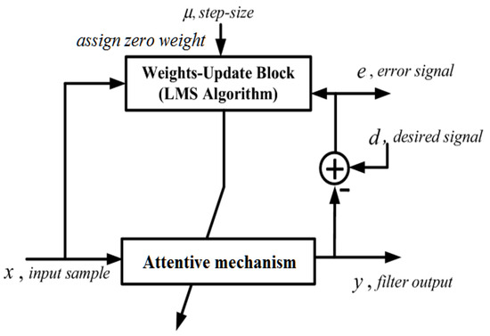 At the final output layer of the CNN, an AW-LMS algorithm is introduced, which iteratively updates the error signal coefficients to subtract inappropriate harmonic frequencies. It assigns zero weight to the retained signal data, ensuring that only relevant neural activity is preserved. By subtracting inappropriate harmonic frequencies, the AW-LMS algorithm further enhances the denoising process and ensures that the resulting EEG signal is free from the misinterpretation of harmonic signals. The simple equation for AW-LMS is given in Equation (5), as follows: