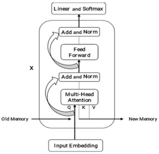 Figure 5 shows the schematic representation of a Transformer-XL. The bottom input embedding transforms a fixed-size vector with “Add & Norm” for the residual link and layer normalization. Multi-head attention incorporates relative location encoding for self-attention, while feed-forward denotes the feed-forward neural network layer. The top output layer employs the Softmax function and linear transformation. x indicates the repetition of operations from “Add & Norm” to “Feed Forward”, with Q, K, and V representing attention mechanism elements, updating memory with old and new information. Formally, Transformer-XL redefines the equation that generates the values Q, K, and V of the attention mechanism as follows by Equations (7) and (8):