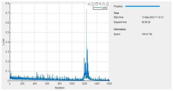The very sharp and tall peak occurs just after the 1200th iteration mark, where the loss value spikes dramatically to just above 0.7, before falling back down. The sharp spike in the loss curve at iteration 1200 likely occurred due to a temporary gradient instability, causing the model to overshoot the optimal weights. Once the gradient adjustments stabilized, the loss value returned to a lower, more consistent range. Other than this peak, most of the loss values seem to be oscillating mostly below 0.1, with several smaller peaks throughout. Figure 12 depicts the MSE of the proposed system with a varied time period.