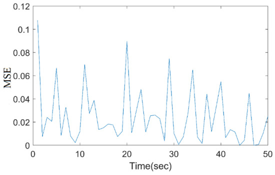 Here, the MSE ranges from 0 to 0.12, with sharp peaks and troughs. The MSE peaks near 0.1 within the first few seconds, then drops back to around 0.02 before rising again. This pattern continues with several peaks and troughs throughout the process.
