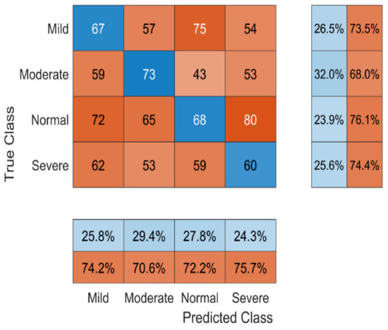 Figure 13 illustrates the confusion matrix of the proposed system for four different classes, such as mild, moderate, normal, and severe.