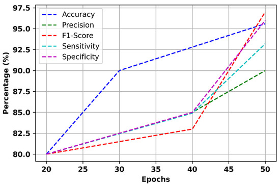 In this section, a detailed explanation of the effectiveness of the suggested technique and the achieved outcome were explained. Figure 14 displays several key metrics such as the accuracy, precision, sensitivity, specificity, and F1 score of the proposed model at various epochs.