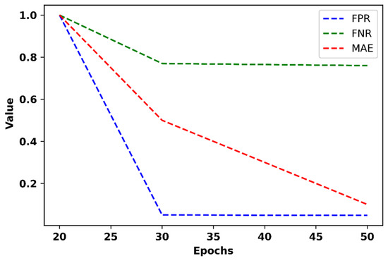 Figure 15 displays the FPR, FNR, and MAE of the proposed model at various epochs.
