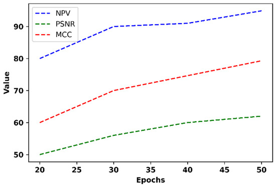Figure 16 displays the suggested model’s NPV, PSNR, and MCC at different epochs.